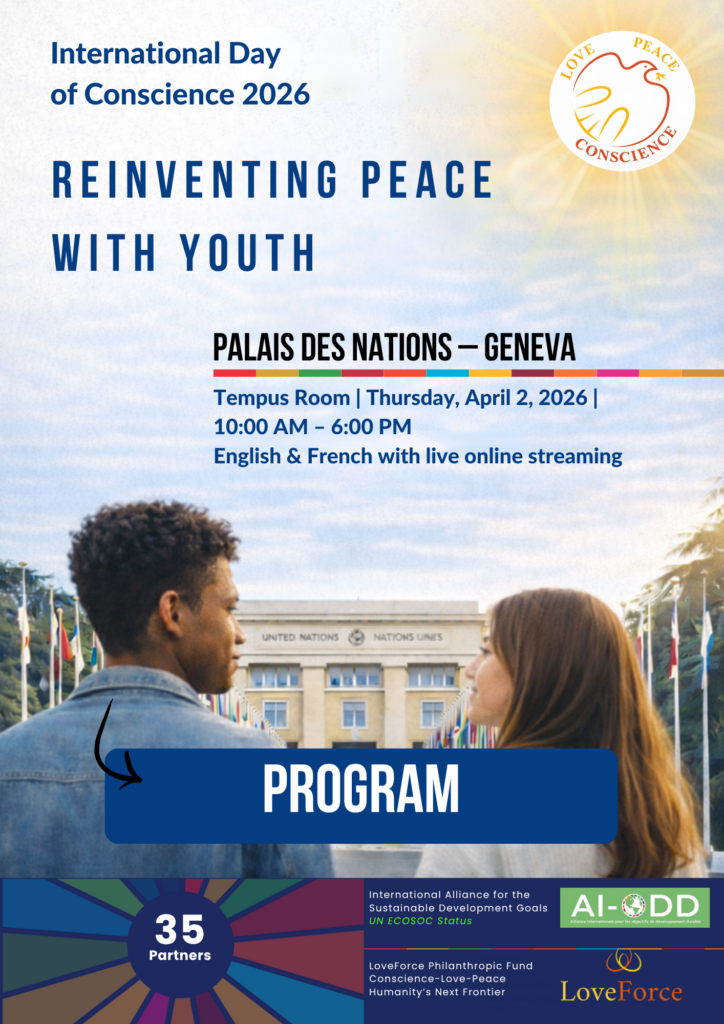 The AI-SDGs (International Alliance for the Sustainable Development Goals) and the Love Force Foundation, in collaboration with some thirty partners (including our NGO and our friends Le Rameau, the CSI and PikPik Environnement), invite you to the symposium they are organising at the UN on the eve of International Consciousness Day (5 April). The aim of this initiative is to bring together all voices around a shared responsibility: to reinvent peace.